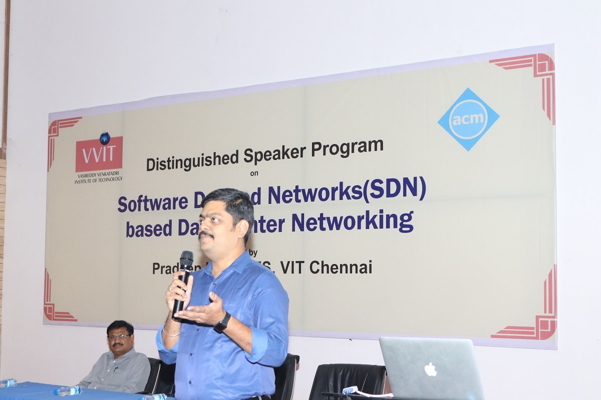 Vasireddy Venkatadri Institute of Technology, under the aegis of its Guntur Association for Computing Machinery (ACM) Student Chapter, invited Dr. T.S.Pradeep Kumar, VIT, Chennai, an ACM India eminent speaker, to deliver his expert lecture on “Software Defined Networks” to the Computer Science Engineering and Information Technology students to day 29-12-2018.